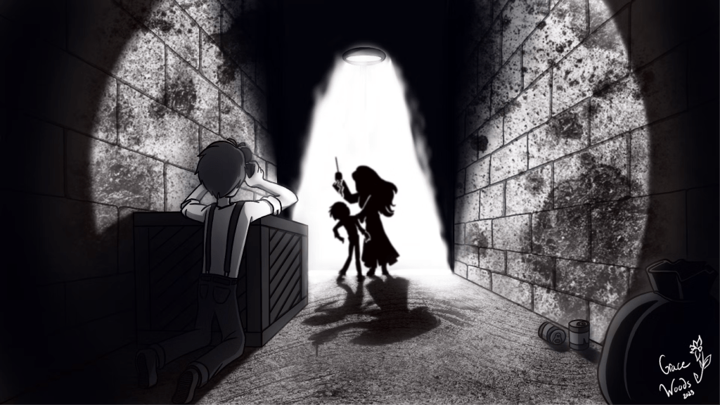 Broken glass rained down onto Sam’s head in a thunderous explosion. He ducked behind the desk, dodging the chair that had been flung through the large office windows. A cold laugh peeled out from the newsroom as the killer advanced, crushing glass shards underfoot. Sam plunged his hands into his pockets and shakily withdrew his lock pick.
